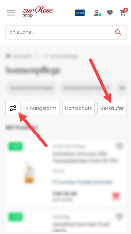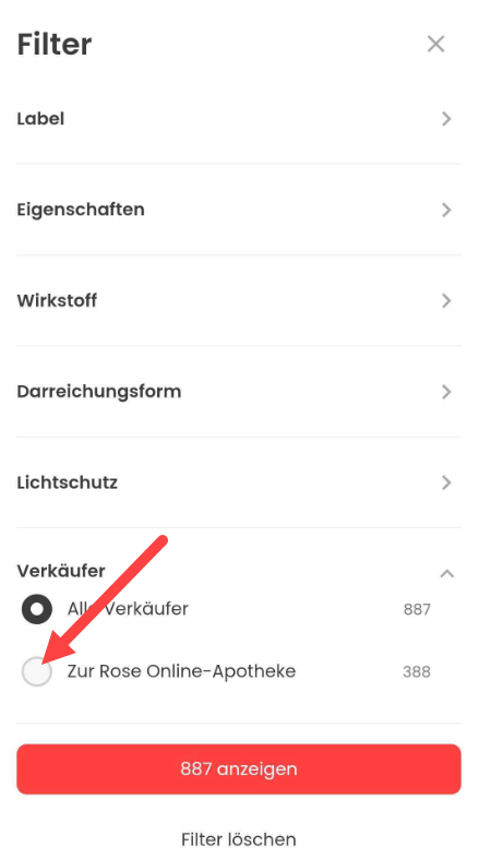 Wenn Sie gezielt nur Produkte des Verkäufers "Zur Rose Online-Apotheke" auswählen möchten, können Sie die Filterfunktion "Verkäufer" nutzen. Diese befindet sich auf allen Produktübersichtsseiten am Ende der Filterliste. Die folgenden Screenshots zeigen Ihnen, wo Sie diese Funktion finden können: