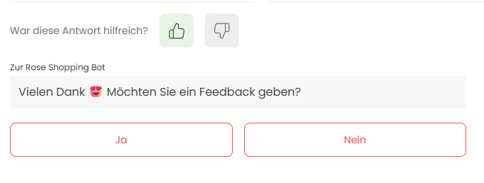 Gut zu wissen: Der Zur Rose Shopping Bot entwickelt sich stetig weiter. Helfen Sie uns, den Service zu optimieren, indem Sie uns Ihr Feedback geben – klicken Sie einfach auf das Symbol "Daumen hoch" oder "Daumen runter" und hinterlassen Sie uns eine Nachricht. Ihre Meinung ist uns wichtig!
