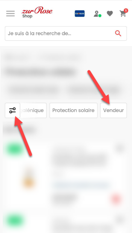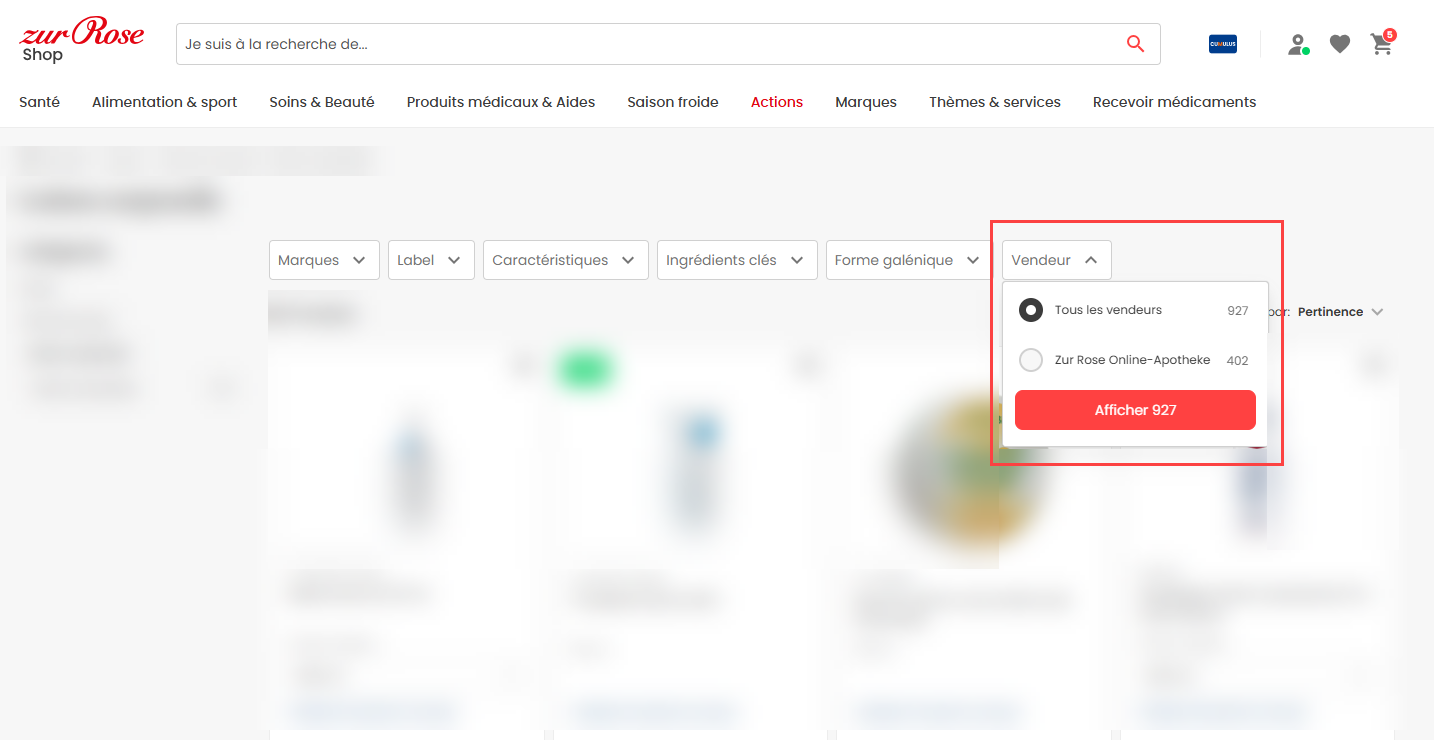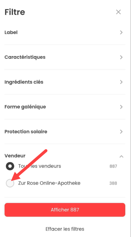 Si vous souhaitez sélectionner uniquement les produits du vendeur « Zur Rose Online-Apotheke », vous pouvez utiliser la fonction de filtre « Vendeur ». Celle-ci se trouve à la fin de la liste des filtres sur toutes les pages de présentation des produits. Les captures d’écran suivantes vous montrent où trouver cette fonction:
