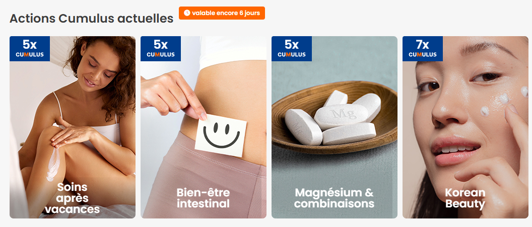 Vous pouvez consulter toutes les offres Cumulus actuelles directement sur notre page : www.zurrose-shop.ch/de/page/cumulus/. Vous avez également la possibilité de cliquer sur l’icône Cumulus dans le Zur Rose Shop pour y accéder directement.