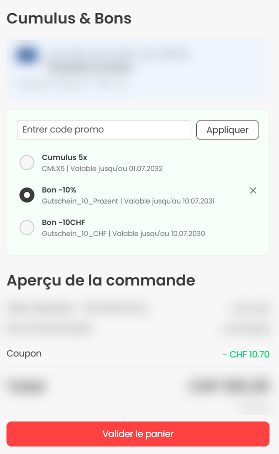 Vous serez ensuite redirigé vers le processus de commande. Vous pouvez alors saisir le code du bon dans le champ prévu à cet effet sous la rubrique "Cumulus & Bons". Activez le code du bon en cliquant sur le champ "Appliquer". Si le bon d'achat est valable, le prix réduit s'affiche alors.
