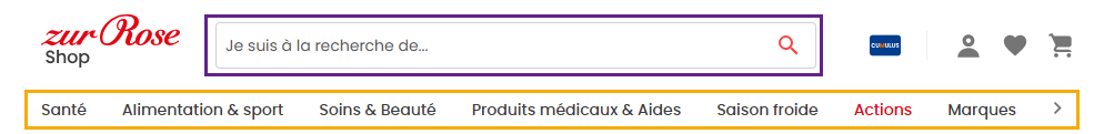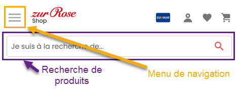 Tout en haut de chaque page du Zur Rose Shop, vous trouverez au centre la barre de recherche de produits et, en dessous, la barre de navigation, ou sur les appareils mobiles, le menu de navigation situé à gauche.