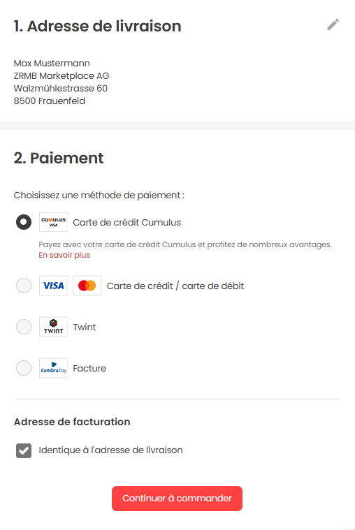 Après avoir sélectionné ou saisi l'adresse de livraison souhaitée, cliquez sur le bouton rouge "Continuer vers le paiement".