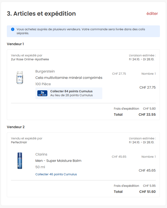 De plus, il vous sera indiqué si votre commande est expédiée par un ou plusieurs vendeurs (boutiques partenaires). Si vous commandez auprès de plusieurs vendeurs en même temps, une information en surbrillance bleue vous indiquera que votre commande sera livrée en plusieurs colis séparés.