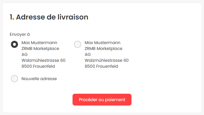 Si une ou plusieurs adresses de livraison ont déjà été enregistrées lors d'une commande précédente, elles vous seront proposées et vous pourrez sélectionner celle de votre choix. Si vous souhaitez entrer une autre adresse de livraison, cliquez sur le bouton à côté de "Nouvelle adresse". Une section supplémentaire s'ouvrira alors, où vous pourrez saisir l'adresse de livraison souhaitée et l'enregistrer.