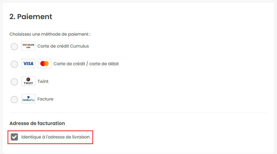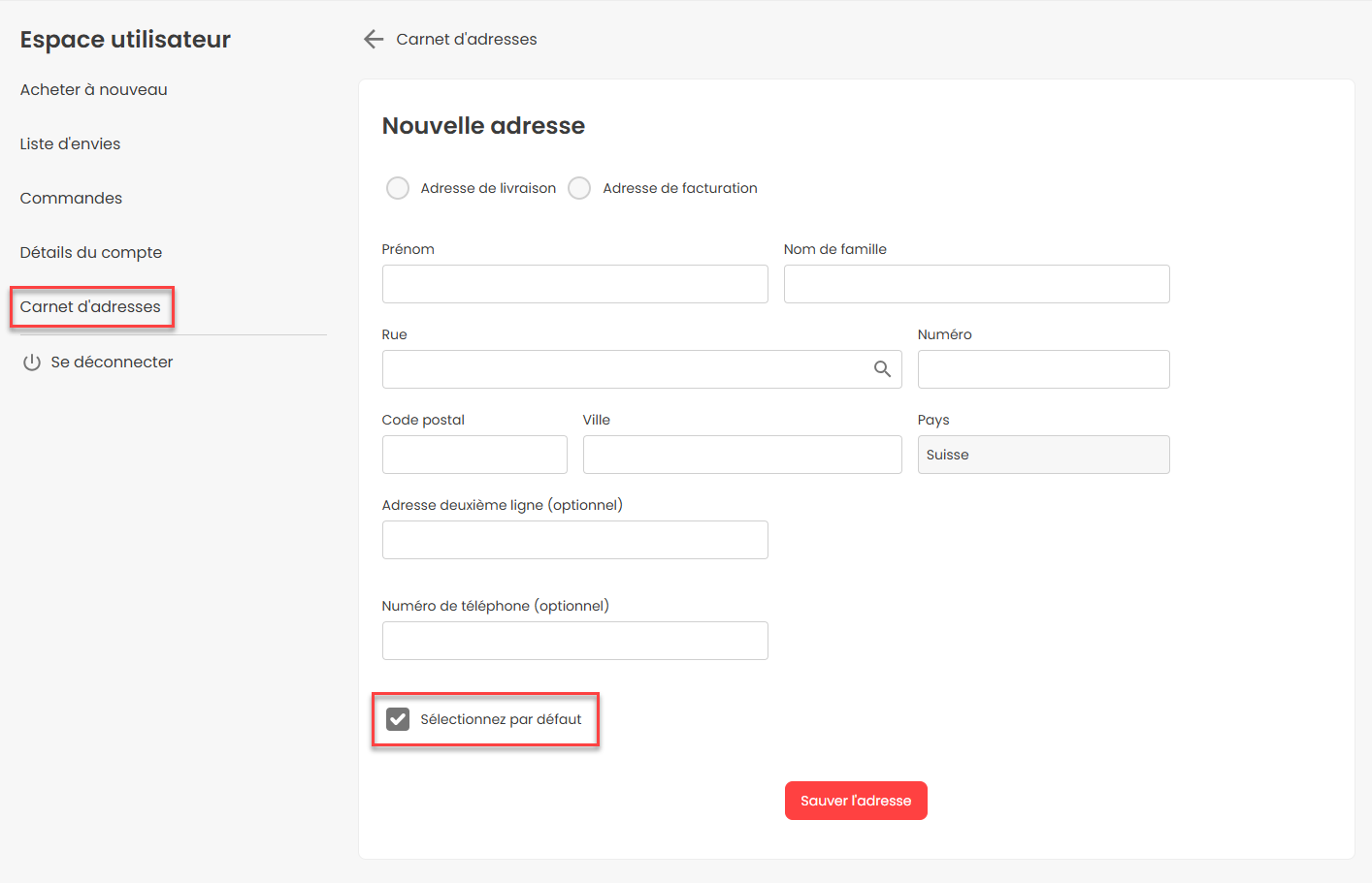 Si vous avez un compte client, vous pouvez créer différentes adresses dans le carnet d'adresses et sélectionner l'adresse de livraison ou de facturation correspondante en cliquant dessus.